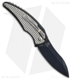 - AUS-8 stainless steel, drop point blade has a black finish, thumb stud opener, and a partially serrated edge.