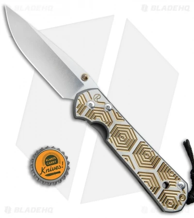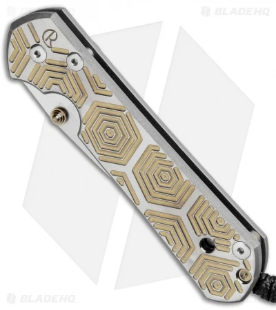 This Large Sebenza 21 features a Gold Hex computer generated graphic (CGG) handle design. The framelock and pocket clip are bead blast finished. It is outfitted with a light stonewashed S35VN stainless steel blade with a gold thumb lug. Includes lanyard and leather pouch.