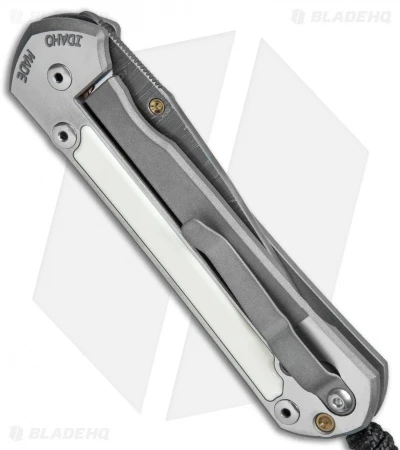 This Large Sebenza 21 model features a Devin Thomas ladder Damascus blade with a gold thumb lug and a satin finished titanium handle with mammoth ivory inlays. The frame lock and pocket clip are bead blast finished titanium.