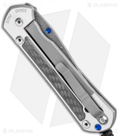We are excited to present this Blade HQ Exclusive Chris Reeve Large Sebenza 21 folder with carbon fiber inlays! The finished product is nothing short of astonishing! The carbon fiber is a top-notch addition to an already outstanding knife. The inlays are set into the satin finished titanium frame. The inlays fit exactly into each of the three pockets machined into the handle, two on the front and one on the back. The blade is made of Raindrop Damascus steel with a blue anodized thumb lug and matching spacer on the handle. The handle edges, lockbar and pocket clip are bead blast finished.