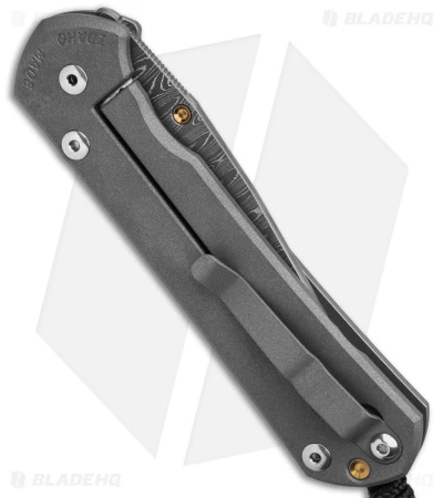 - Milled titanium handle scales with a unique graphic and a pyrite cabochon stone inlay.