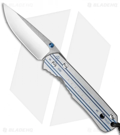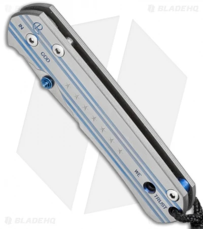 This Small Sebenza 21 features a satin finished titanium handle face with an “In God We Trust” computer generated graphic (CGG). The framelock and pocket clip are bead blast finished. Outfitted with a blue thumb lug and spacer. This Sebenza has a polished S35VN stainless steel blade. Includes lanyard and leather pouch.