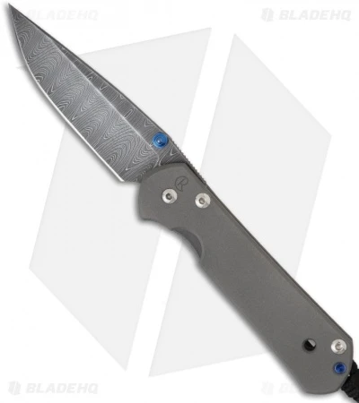 This Small Sebenza features a stainless steel Devin Thomas “Ladder” Damascus blade with a blue anodized titanium thumb stud. Actual Damascus blade may differ slightly from the one pictured.