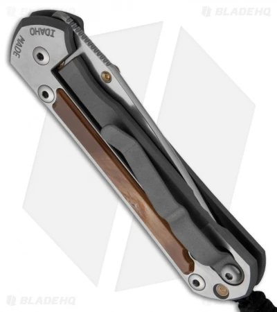 This Small Sebenza 21 model features a satin finished titanium handle with Mammoth Bark inlays. The frame lock and pocket clip are bead blast finished titanium. S35VN stainless steel blade with polished gold thumb lug.