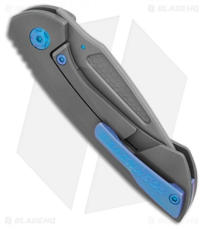 This Dorado model has a bead blasted titanium frame lock handle, a matching bead blasted blade, and blue anodized hardware.