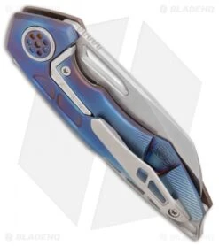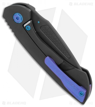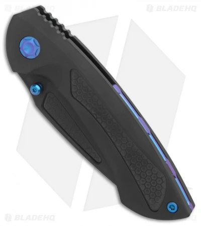 This Dorado model has a black DLC coated titanium frame lock handle, a matching DLC blade, and blue anodized hardware.