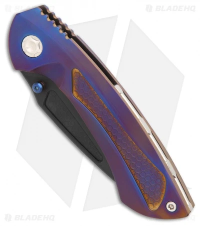 This Dorado model has a bronze/purple anodized titanium frame lock handle, a DLC coated blade, and satin finished hardware.