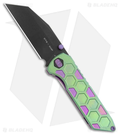 - Purple and green anodized titanium frame with checkered hexagonal milling.