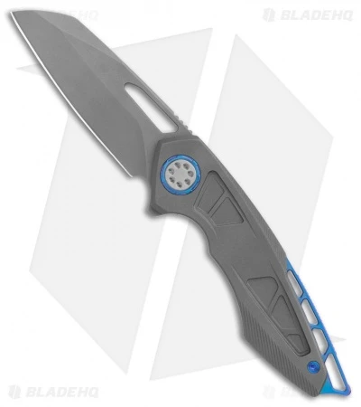This Neptune model has a bead blasted titanium handle with blue anodized hardware. Its blade is made from bead blasted CPM-154 stainless steel.