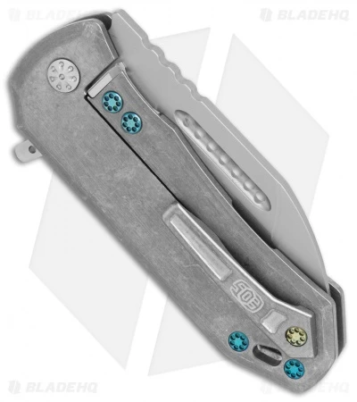 This Orca-SW knife has a bead blasted blade and a stonewashed titanium handle with green anodized hardware.