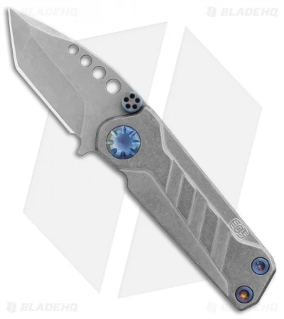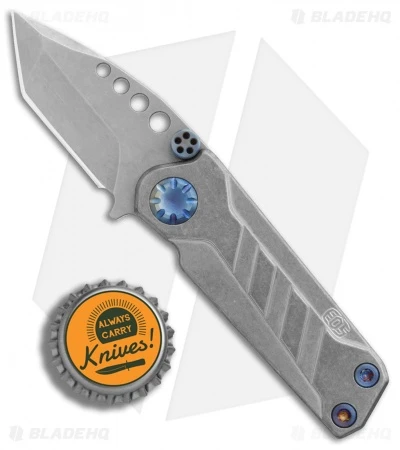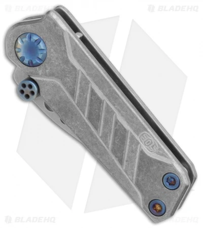 This EOS Prawn friction folder has a tumbled titanium handle with blue heat colored hardware. It sports a tanto blade made from durable D2 tool steel in a stonewashed finish. While the knife doesn’t lock, the blade can be held open or closed by adjusting tension on the thrust washers. The Prawn’s compact build allows easy carry in a backpack, gear bag, or pocket.