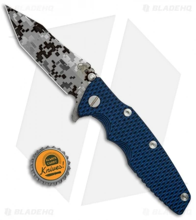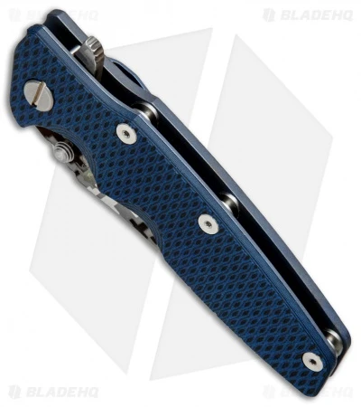 - Textured black/blue G-10 front handle scale with titanium frame.