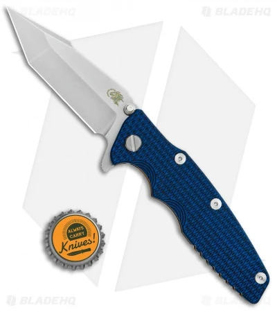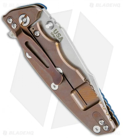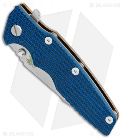 - Textured black/blue G-10 front handle scale with bronze titanium frame.