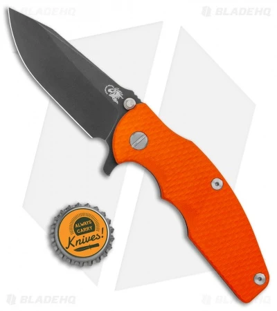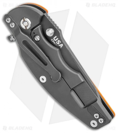 - Orange textured G-10 scale with titanium frame.