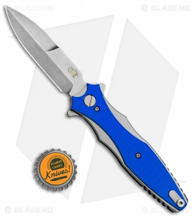 This Maximus model is equipped with a bayonet style blade with an unsharpened swedge and a stonewashed finish. Its titanium frame is outfitted with textured blue G-10 scales.