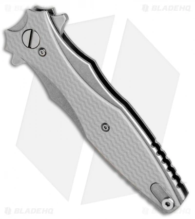 This Maximus model is equipped with a bayonet style blade with an unsharpened swedge and a stonewashed finish. Its titanium frame is outfitted with textured gray G-10 scales.