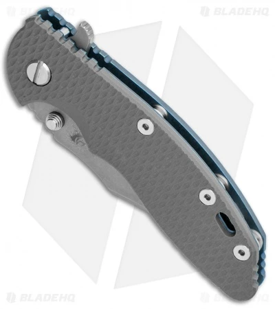 This XM-18 model sports a gray G-10 handle, a blue titanium frame, and a 3.5″ Bowie blade with a working finish.