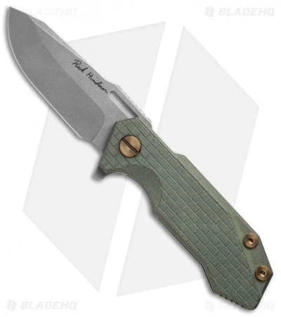 The Half Track may be modest in size, but its modesty ends there. This overbuilt frame lock folder is armed with a durable CPM-S35VN blade with a working finish and aggressive no-slip jimping. The handle scales are 0.165″ green anodized titanium slabs with a brick wall pattern. Bronzed hardware and a copper lockbar stabilizer adds fantastic contrast to this rare piece.