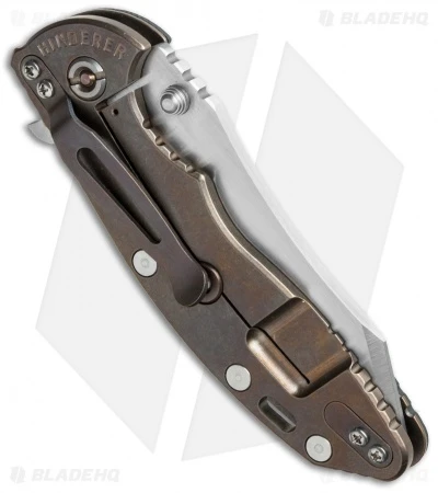 This custom Hinderer XM-18 knife has a hand ground Skinner style blade with flipper opener. The handle has an XM-textured G-10 scale and bronzed, tumbled titanium framelock with the Hinderer lockbar stabilizer and reversible right-hand carry pocket clip. The XM-18 folder is a spectacular knife that deserves the attention and praise it’s received over the years.