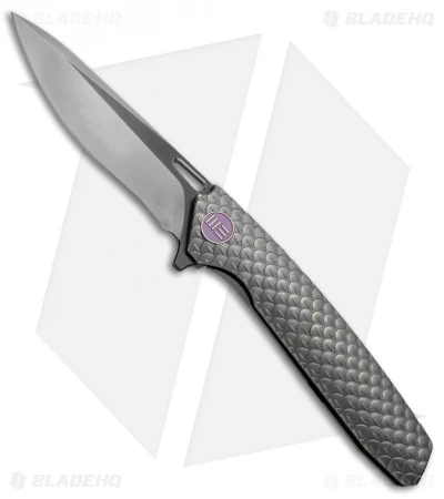 The We Knife Co. 604J offers a long elegant design with a sleek recurve blade in a two-tone finish. Satin grinds and black finished flats add to the sophisticated appeal of the blade. The titanium handle comes with a scaled texture that provides a utilitarian grip as well as a collectible custom appearance. Purple anodized hardware and a titanium clip finish off the stellar design.