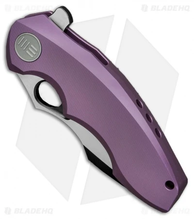 The 605A represents We Knife Co’s most compact EDC flipper to date. With a 3″ blade and a sturdy titanium handle, the 605 is built strong enough to handle any cutting chore, big or small. The frame lock handle features a reinforced lock bar and an ergonomically contoured grip. It has a modified drop point blade with a choil and thumb rest for choking up your grip for more leverage. A blade flipper and an ample thumb hole provide diverse deployment options. This 605A model has a purple anodized handle with bronzed hardware and a two-tone finished blade.