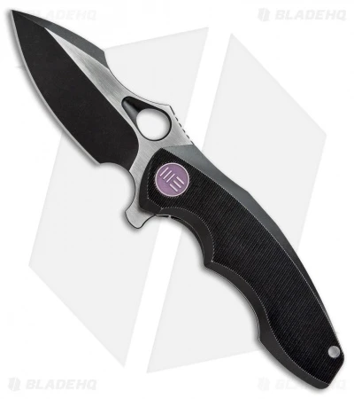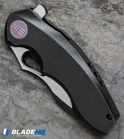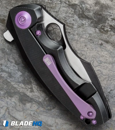 The 605C represents We Knife Co’s most compact EDC flipper to date. With a 3″ blade and a sturdy titanium handle, the 605 is built strong enough to handle any cutting chore, big or small. The frame lock handle features a reinforced lock bar and an ergonomically contoured grip. It has a modified drop point blade with a choil and thumb rest for choking up your grip for more leverage. A blade flipper and an ample thumb hole provide diverse deployment options. This 605C model has a black anodized handle with purple hardware and a two-tone finished blade.