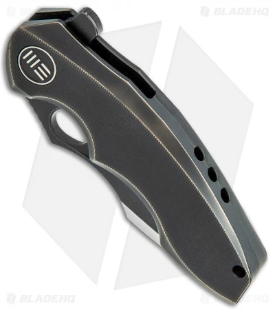 This 605M model has a bronze anodized handle and a two-tone finished blade with black flats and satin finished grinds. The 605 series represents We Knife Co’s most compact EDC flipper to date. With a 3″ blade and a sturdy titanium handle, the 605D is built strong enough to handle any cutting chore, big or small. The frame lock handle features a reinforced lock bar and an ergonomically contoured grip. It has a modified drop point blade with a choil and thumb rest for choking up your grip for more leverage. A blade flipper and an ample thumb hole provide diverse deployment options.