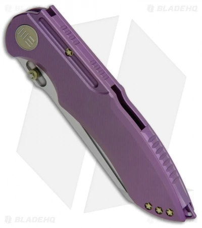 The WE Knife Co. 620B is a resilient frame lock folder made with premium materials and built-to-last construction. Its wharncliffe style blade features deep notched jimping, ambidextrous thumb studs, and a two-tone finish with stonewashed grinds and satin flats. Ergonomic contouring, double choil grip, and subtle texturing ensures security in-hand at all times. The 620B is equipped with ceramic ball bearings for quick, responsive blade deployment. This model has a purple anodized titanium handle with bronzed hardware.
