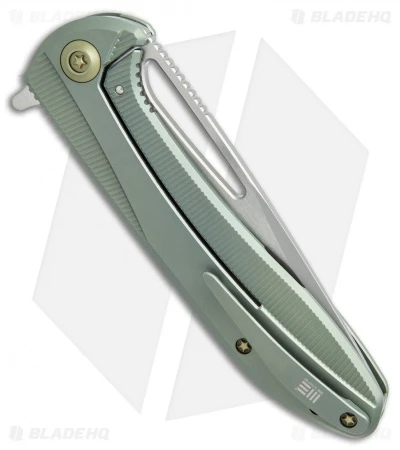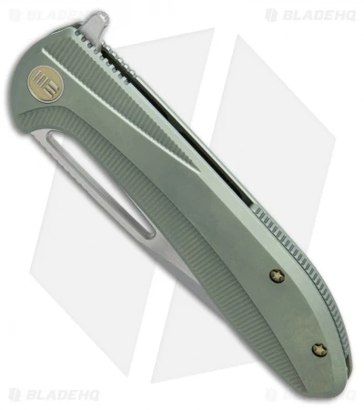 This Cirrus 615F model is outfitted with a green titanium handle and a two-tone blade with satin flats and bead blasted grinds. The We Knife Co. Cirrus flipper was designed by knife-maker Simon Crafts for streamlined EDC comfort. It has a high performance CPM-S35VN steel blade and a titanium frame lock handle with a titanium pocket clip and back spacer. Jimping and textured machining on the handle provide improved grip in difficult conditions. Bronze anodized hardware adds a classic finishing touch to the design.