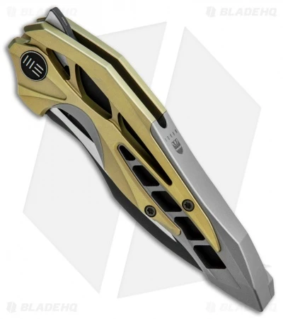 This model of the WE Knife Co. Arrakis sports a gray and gold anodized titanium handle with a two-tone M390 blade.