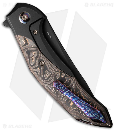 - Black titanium handle scales with a copper foil carbon fiber inlay.