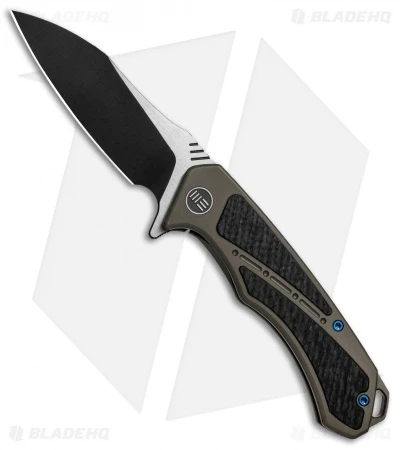 This Minitor model has a bronze anodized titanium frame lock handle with carbon fiber inserts. Its blade is two-tone finished with black grinds and satin flats.