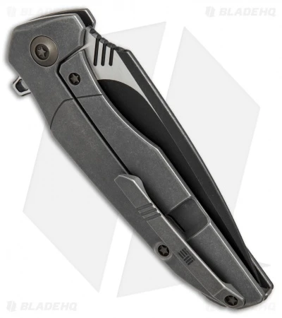 The 707A Nitida has a two-tone finished blade with black stonewashed grinds and satin flats. It sports a gray titanium frame lock handle with a carbon fiber inlay.