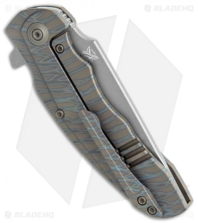 - Flamed tiger stripe design on the titanium frame lock that provides durability and over-travel protection.
