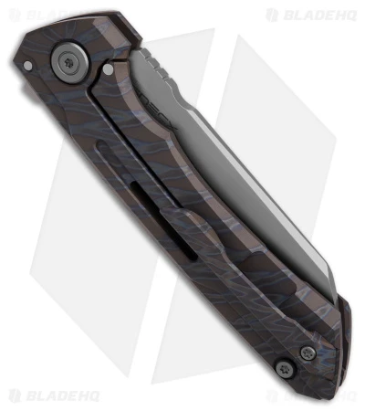 - Tiger striped flamed titanium handle.