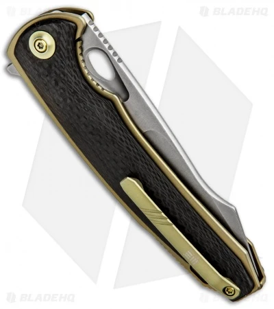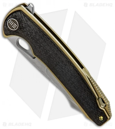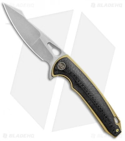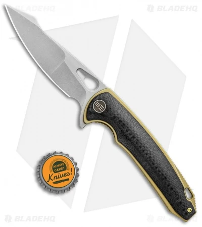 The Yucha from WE Knife Co. offers a sleek titanium build for stylish gentlemen’s carry. This Yucha model is outfitted with a stonewashed harpoon style blade and a gold anodized titanium frame with carbon fiber scales. The flipper blade glides open effortlessly on WE’s ceramic ball bearing pivot. Thumb rest jimping and an index choil provide a secure grip for any difficult cutting task. Class up your everyday carry rotation with the WE Knife Co. Yucha.